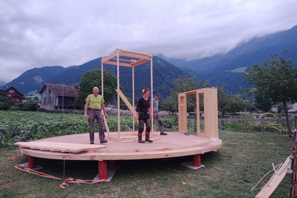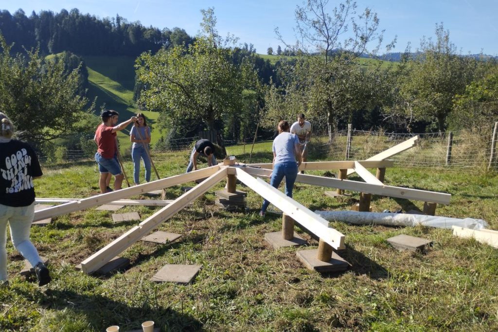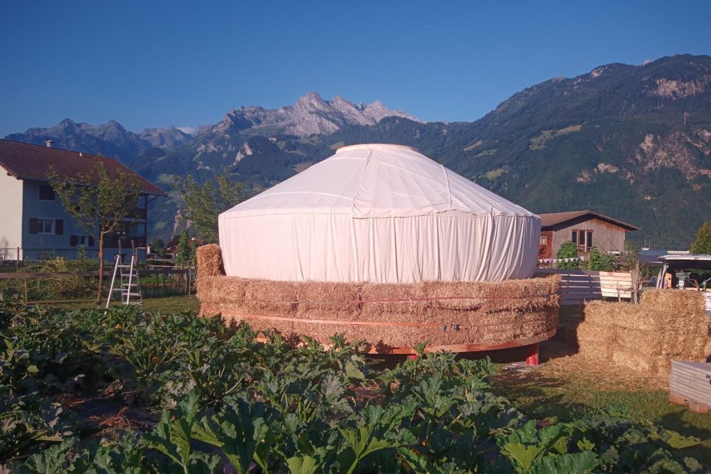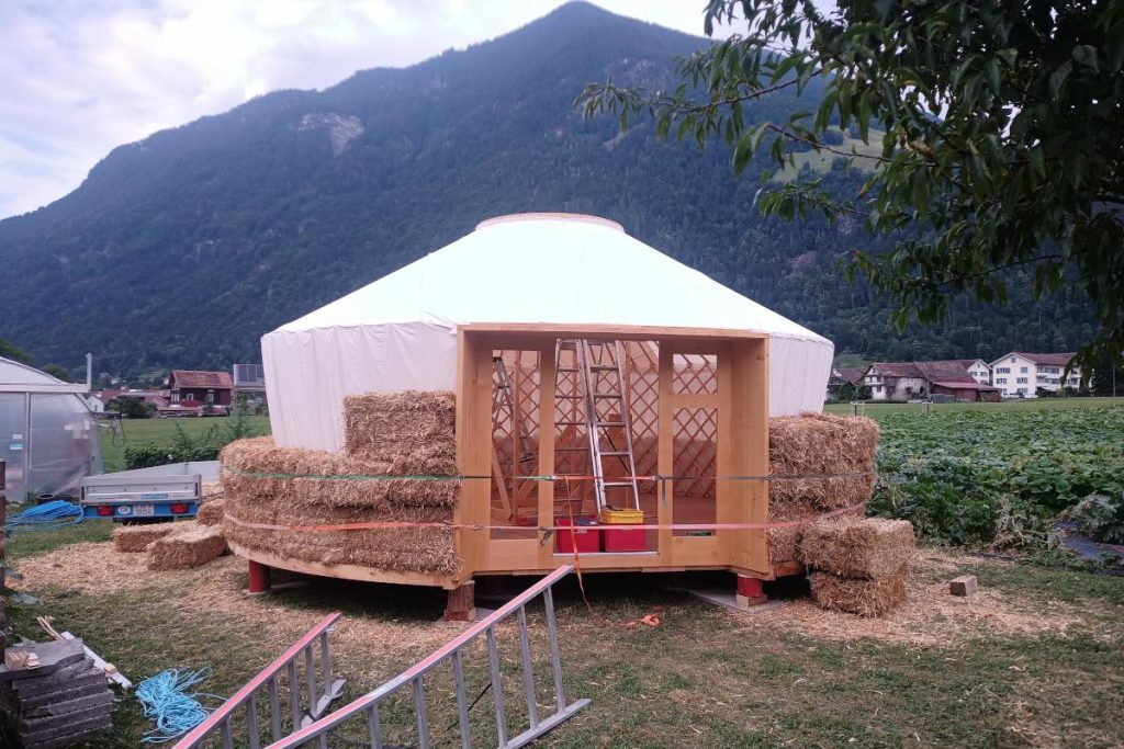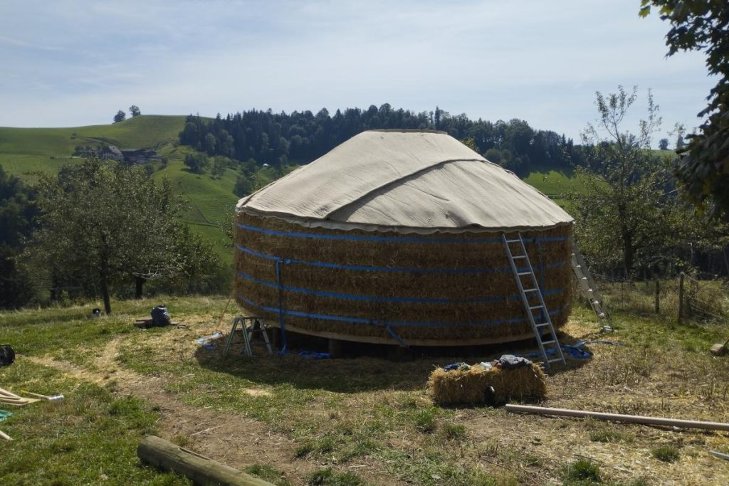 Diese Bilder zeigen den Bau einer Wohnjurte mit Strohisolation im Entlebuch – vom Fundament über den Wandaufbau bis zur fertig aufgebauten Jurte.