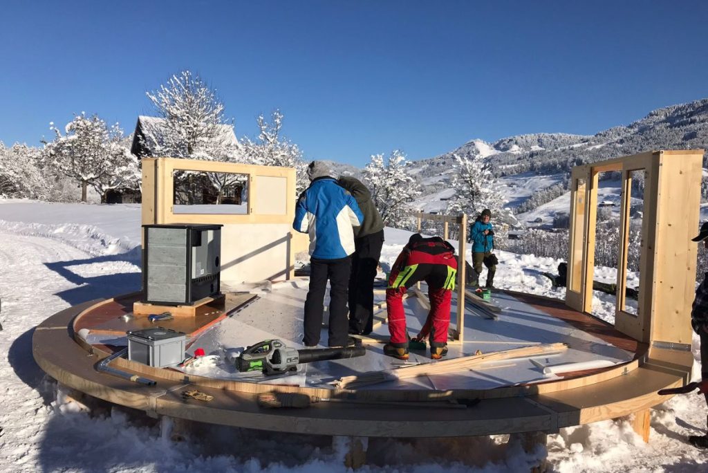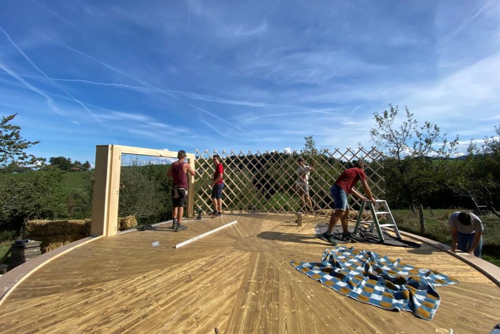 Einblicke in den Aufbau von Jurten: Bodenplattformen, Konstruktion, Dämmung und handwerkliche Details. Diese Bilder zeigen die Arbeit hinter dem fertigen Raum.