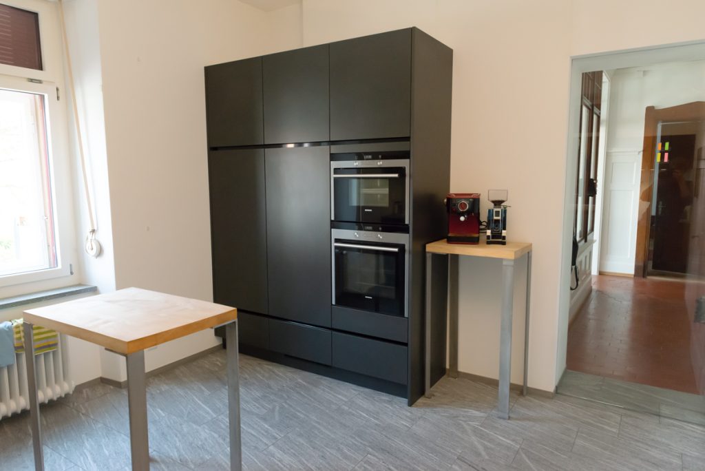 Grifflose, dunkel gehaltene Fronten sorgen für eine zurückhaltende Optik, während Arbeitsfläche und Geräte logisch und alltagstauglich angeordnet sind.